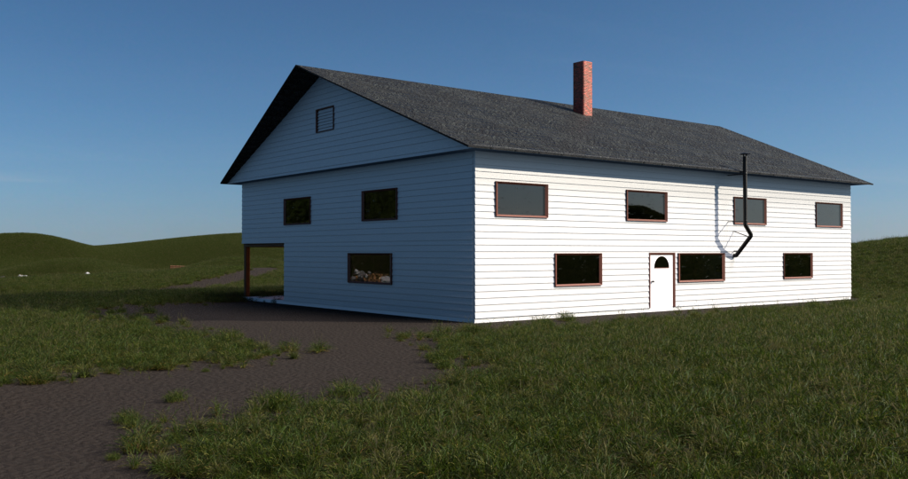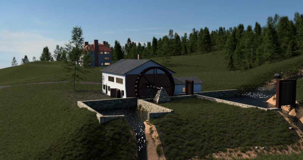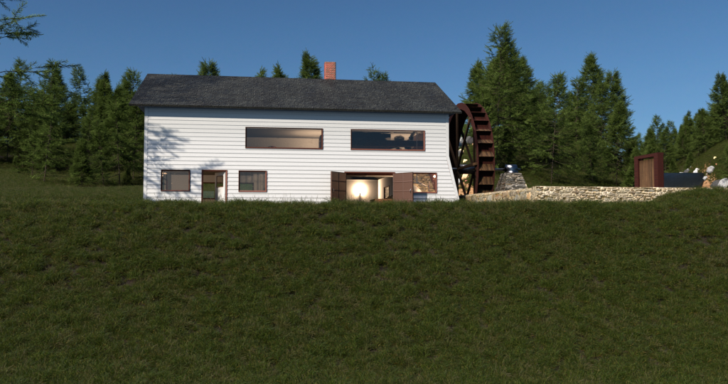 The Mill has two stories. Through the main door is the general store area, a staircase to the second floor and a door to the Gear-House. The Gear-House is on the water-wheel side and includes a grinder and mechanisms to attach saws in the shop area. Up the stairs is living quarters with two sleeping rooms, kitchen, living, dinning area and a stairwell to the attic for extra storage.