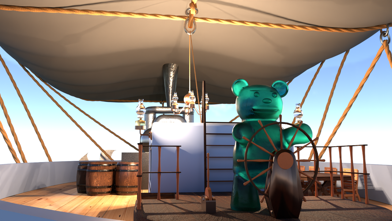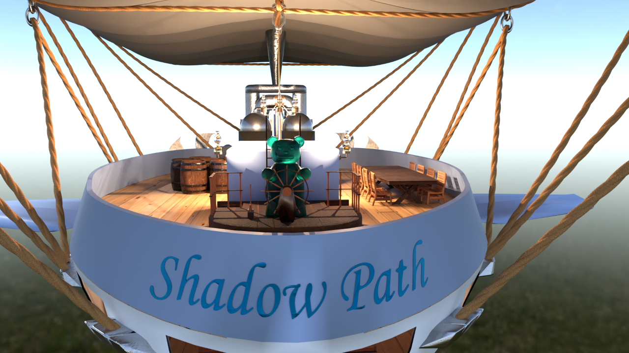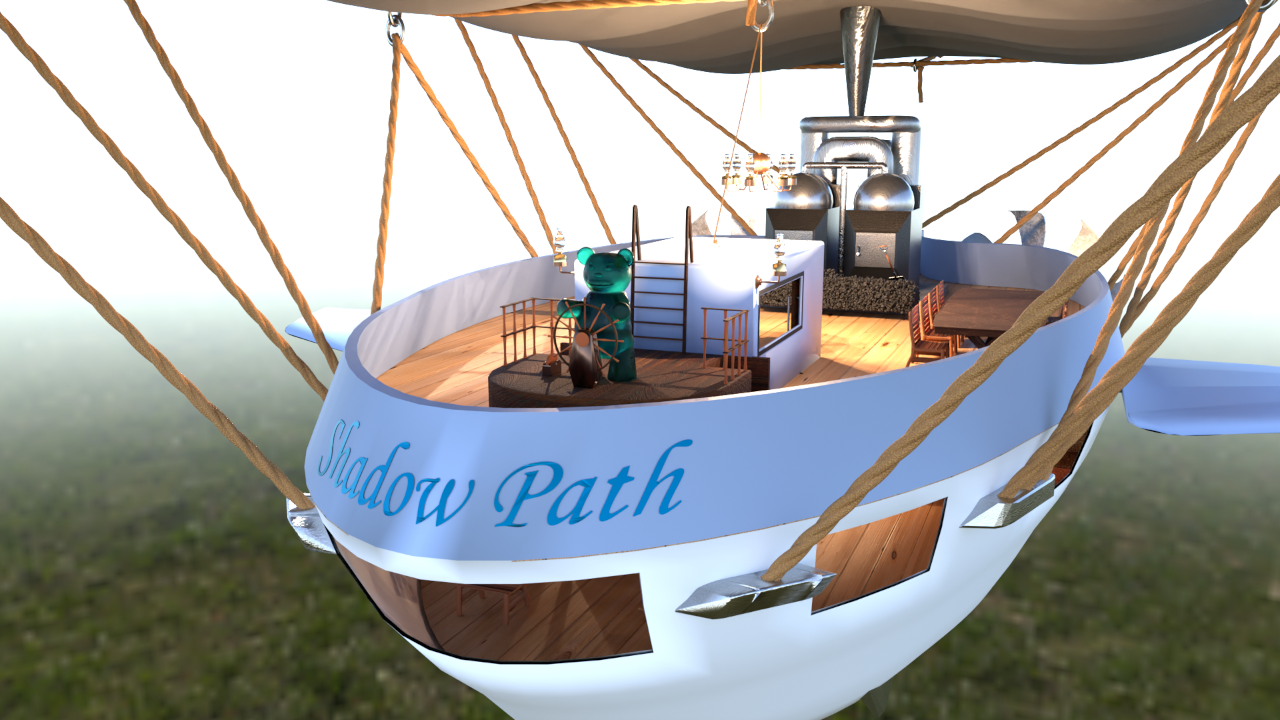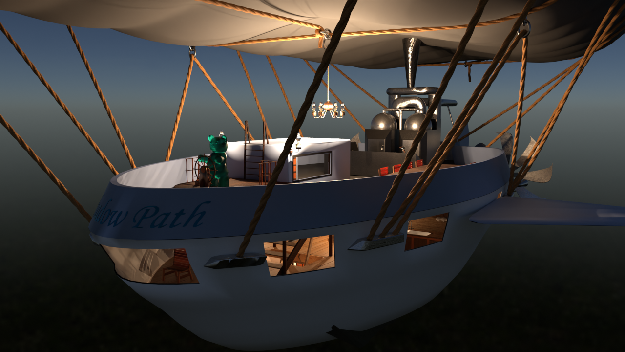 The “Shadow Path” was designed and built by Samir, one of the Green Queens master craftsman. Samir grew up in the ship building yards to the south of Grimondale. He became a master craftsman and The Master Shipbuilder in the Green Queens service as a young gummie bear. Helping design and build many ships in her queens fleet. After years of labor, Samir was able to build and finished a dirigible to his satisfaction. He now explores the lands, trading and bringing news from all around.