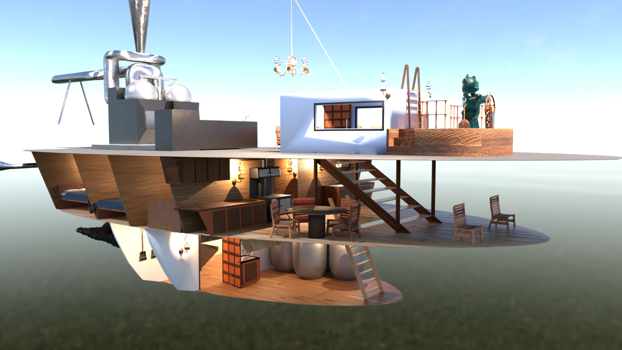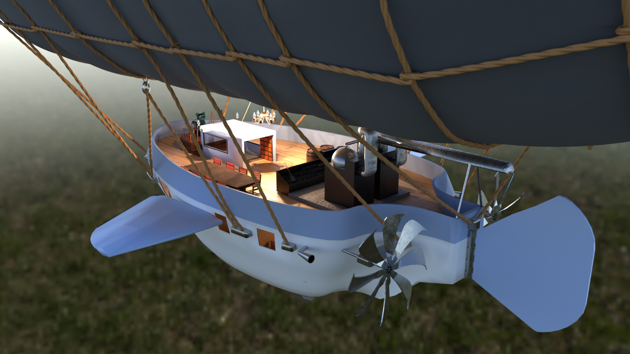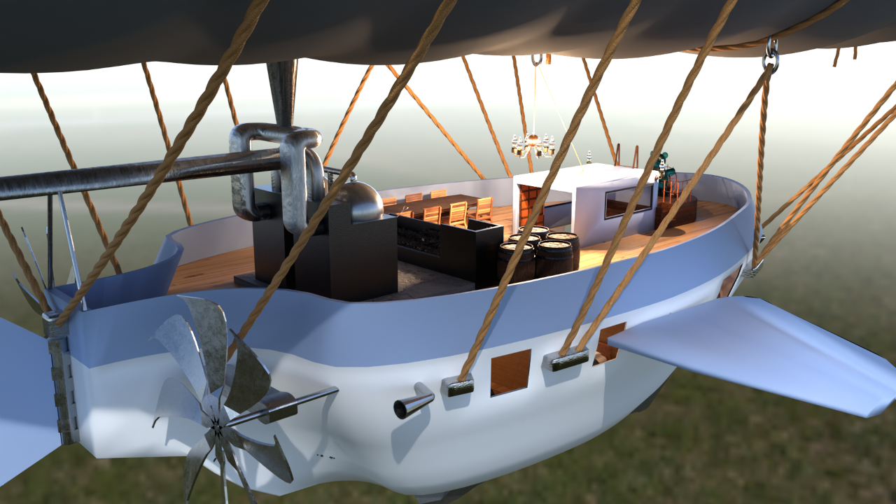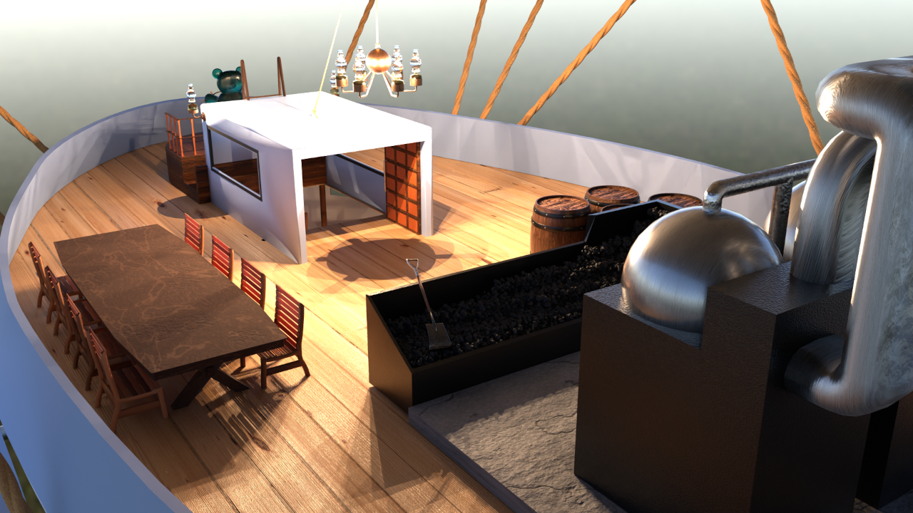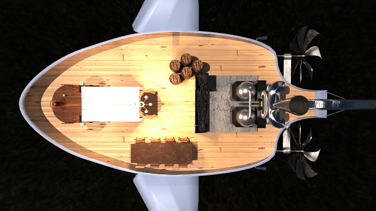 Mid-Upper Deck is an open area used as needed depending on cargo. Captain Samir does keep a large dinning table on the Upper Deck in order to provide food and entertainment to his guests, especially when docked outside of villages. Next on deck is the coal trough and boilers, they store and produce steam and heat to run the water pumps, propellers in the rear, coal belt, as well as provide hot air to the balloon. In the very rear of the Upper Deck, there is a coal chute covered by a trap-door that leads strait to the Lower Deck.