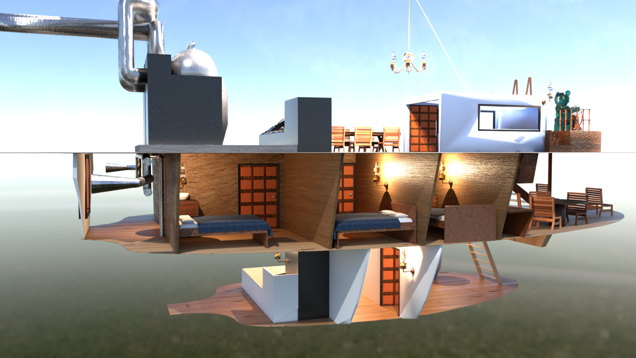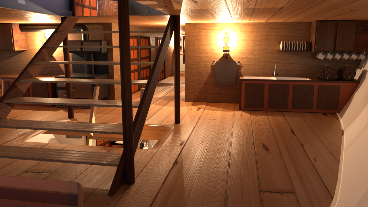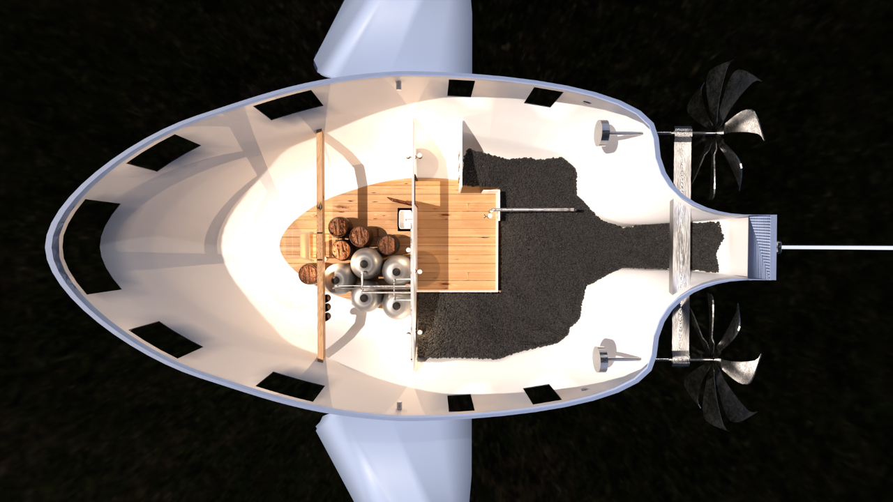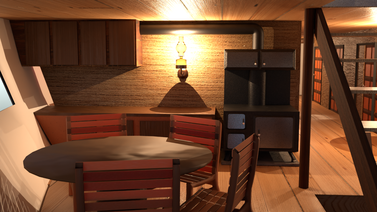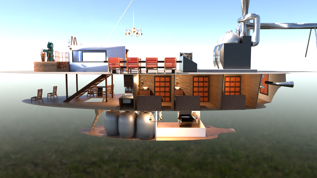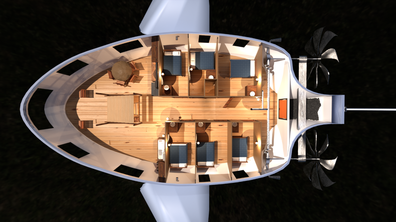Mid-Upper Deck is an open area used as needed depending on cargo. Captain Samir does keep a large dinning table on the Upper Deck in order to provide food and entertainment to his guests, especially when docked outside of villages. Next on deck is the coal trough and boilers, they store and produce steam and heat to run the water pumps, propellers in the rear, coal belt, as well as provide hot air to the balloon. In the very rear of the Upper Deck, there is a coal chute covered by a trap-door that leads strait to the Lower Deck.