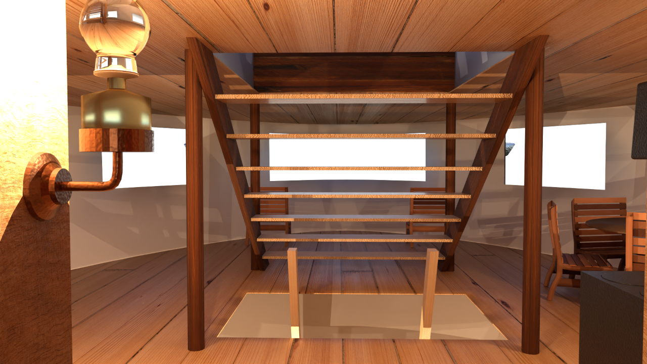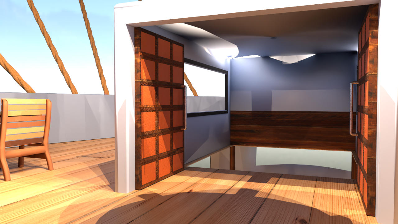 At the forward of the Upper Deck is the Captains Deck. A raised platform to enable better sight over the ships railing. The steering wheel and propeller speed lever are located here. To the rear is a ladder to climb the stairwell house in order to light the ships chandler. It also provides a better lookout point when in flight. There are two storage door on the sides of the Captain Deck that has extra rope, cloth and repair resin for the balloon.