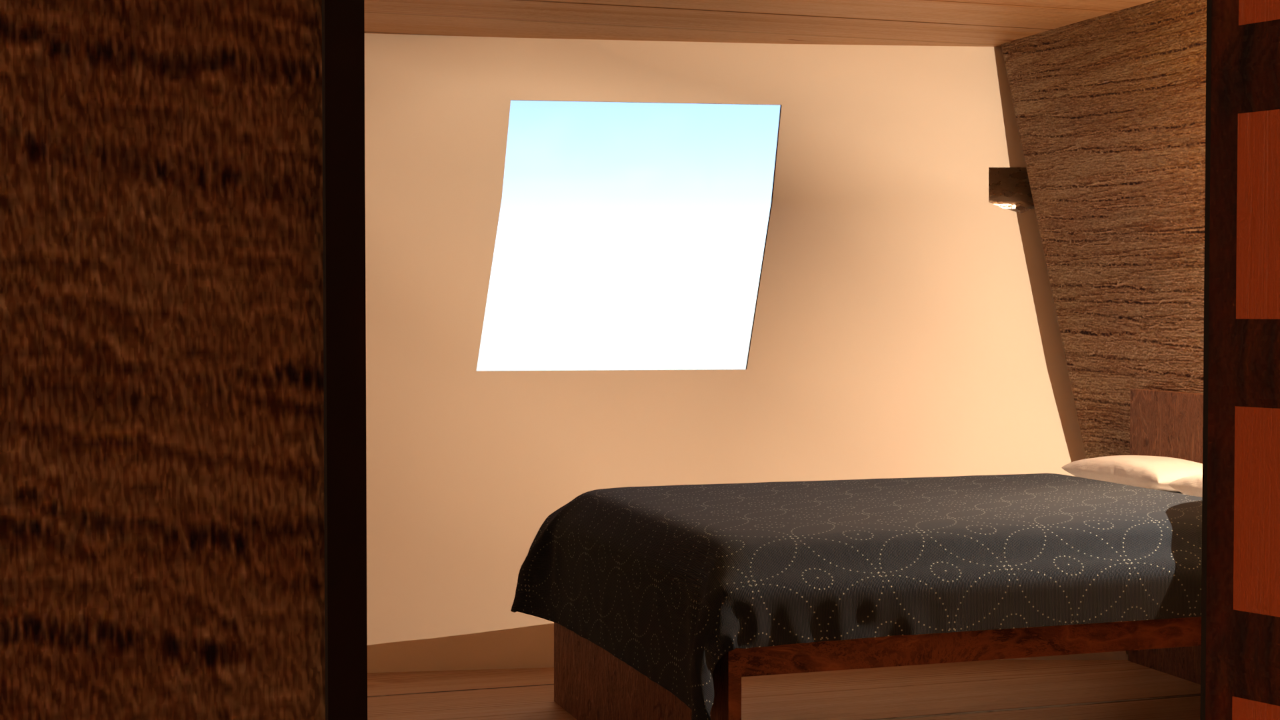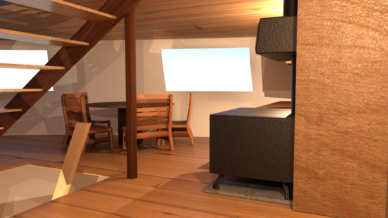 The Mid-Deck contains the common area with one huge curved window to the front as one comes down the stairs. This window gives a 120 degree view from the front while inside. This is followed by two more windows on the sides, smaller but no less impressive. The starboard side has a small table and chairs, a Franklin stove to heat and cook meals on as well as cabinetry for storage. The port side has a double sink as well as the much appreciated wine barrels on the counter, dishes and more storage cabinetry. Behind the stairs is an open hole and ladder that leads to the lower deck.
