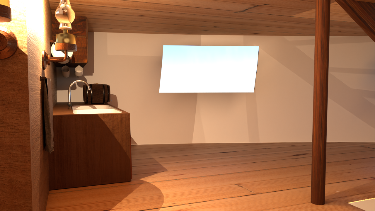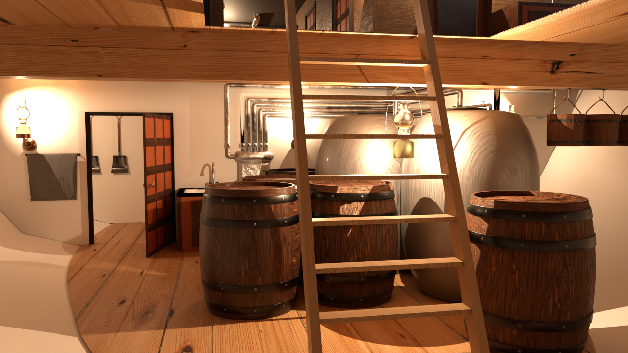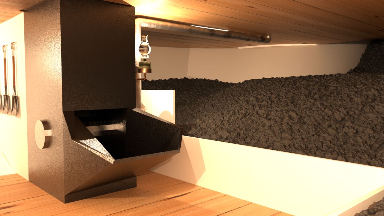 The Lower-Deck is broken into two main rooms, a storage room and the Coal Room. Coming down the ladder, there are five huge water tanks port side as well as some open storage. When the Mid-Deck rooms are full of guests, there is a hammock spot next to the water tanks where crew can sleep. The rear wall contains a small cleanup sink as well as all the pipping and controls for pressure and water flow. Through the door is the coal room, occasionally the hopper needs filled that provides coal to the Upper-Deck trough.